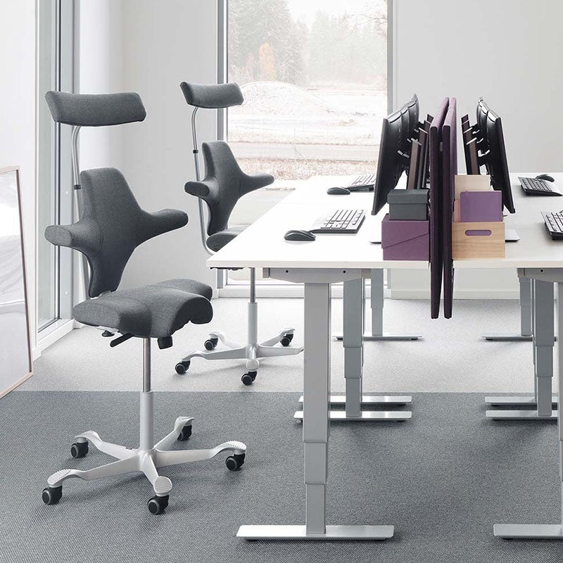 Capisco 8107 med rygg och nackstöd är en klassisk bästsäljare. Modellen har sina rötter så långt tillbaka som 1974, har under årens gång hela tiden uppdaterats för att främja funktionen och optimera tillverkningsprocessen. Sadelstolen har en ikonisk design med grundtanken att erbjuda en sitthållning likt den på en hästsadel. Stolen är justerbar för att kunna användas i både låg och hög arbetsposition, hela vägen upp till stående position. Capisco tillåter ett dynamiskt sittande med balanserat stöd oavsett sitthöjd och position. Stativet har fem armar (Ø730 mm) med lättrullande hjul vilket ger en stabil sittkänsla. Lämplig för bord med arbetshöjd 720 mm och däröver.