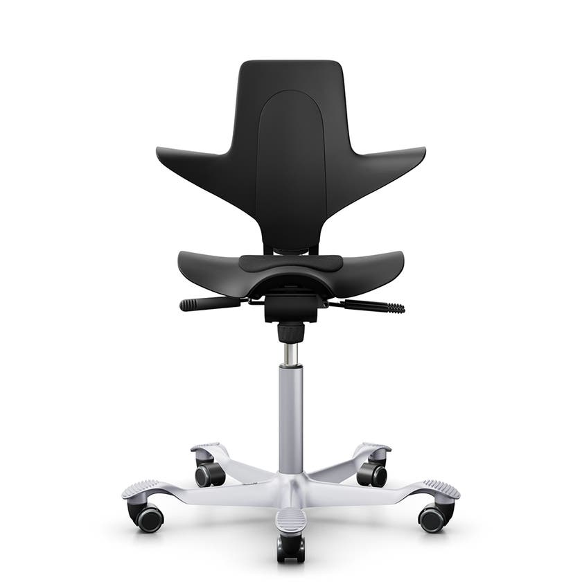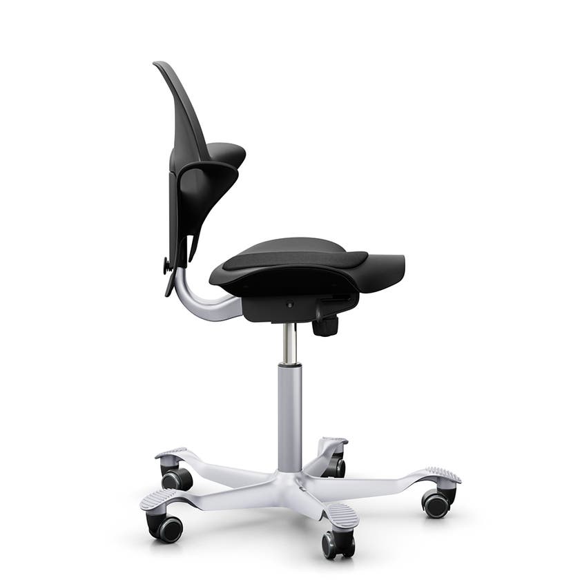 Kontorsstol Capisco Puls 8010, sadelsits med ryggstöd, Svart plast, Sittkudde svart tyg Xtreme, sitthöjd 455 - 640 mm, hjul