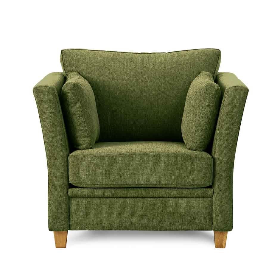 Stilren fåtölj/1-sitssoffa Dante i hög kvalitet och med mycket god sittkomfort. Klädd i slitstarkt tyg, välj mellan flera olika färger. Ben i oljad ek.