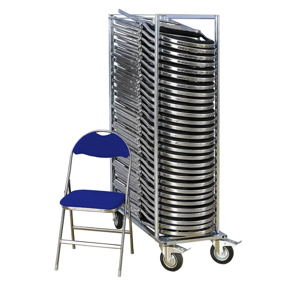 Paket med 30 st bekväma klappstolar med kromat stativ och stoppad sits och rygg. Klädd med tyg i färgerna svart, blå eller grå. Bekvämt bärhandtag i ryggen.