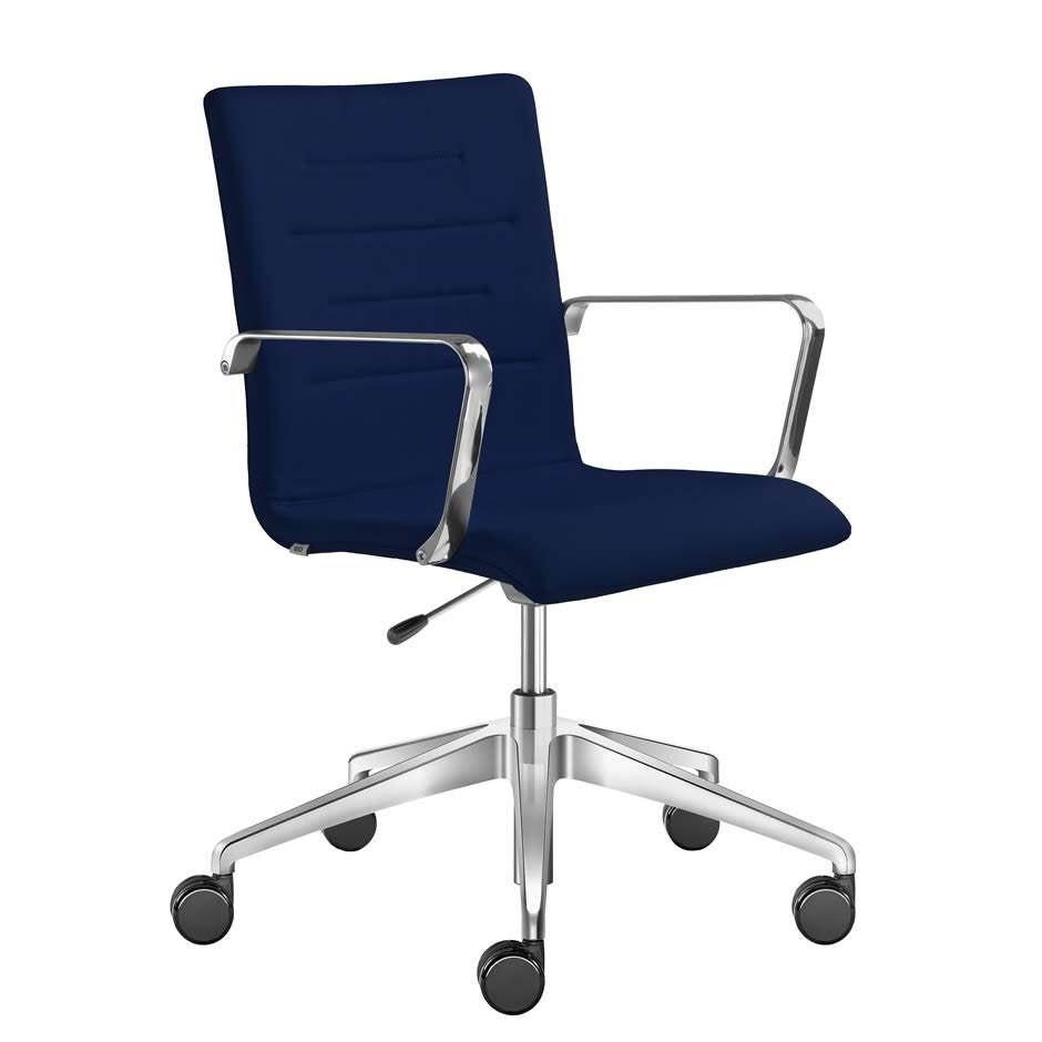 Stilren konferensstol på hjul med exklusiv känsla. Valbar i 8 färger Xtreme-tyg. Med underrede och armstöd i borstad aluminium. Som tillval finns skinnklädda armstöd och gungfunktion.