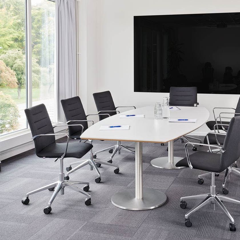 Stilren konferensstol på hjul med exklusiv känsla. Valbar i 8 färger Xtreme-tyg. Med underrede och armstöd i borstad aluminium. Som tillval finns skinnklädda armstöd och gungfunktion.