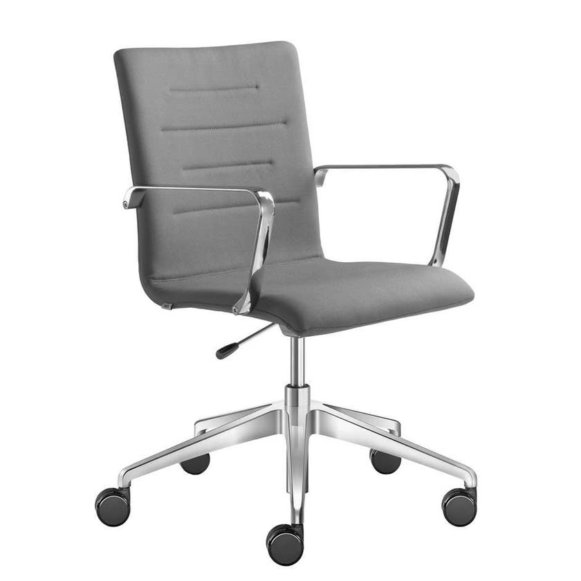 Stilren konferensstol på hjul med exklusiv känsla. Valbar i 8 färger Xtreme-tyg. Med underrede och armstöd i borstad aluminium. Som tillval finns skinnklädda armstöd och gungfunktion.