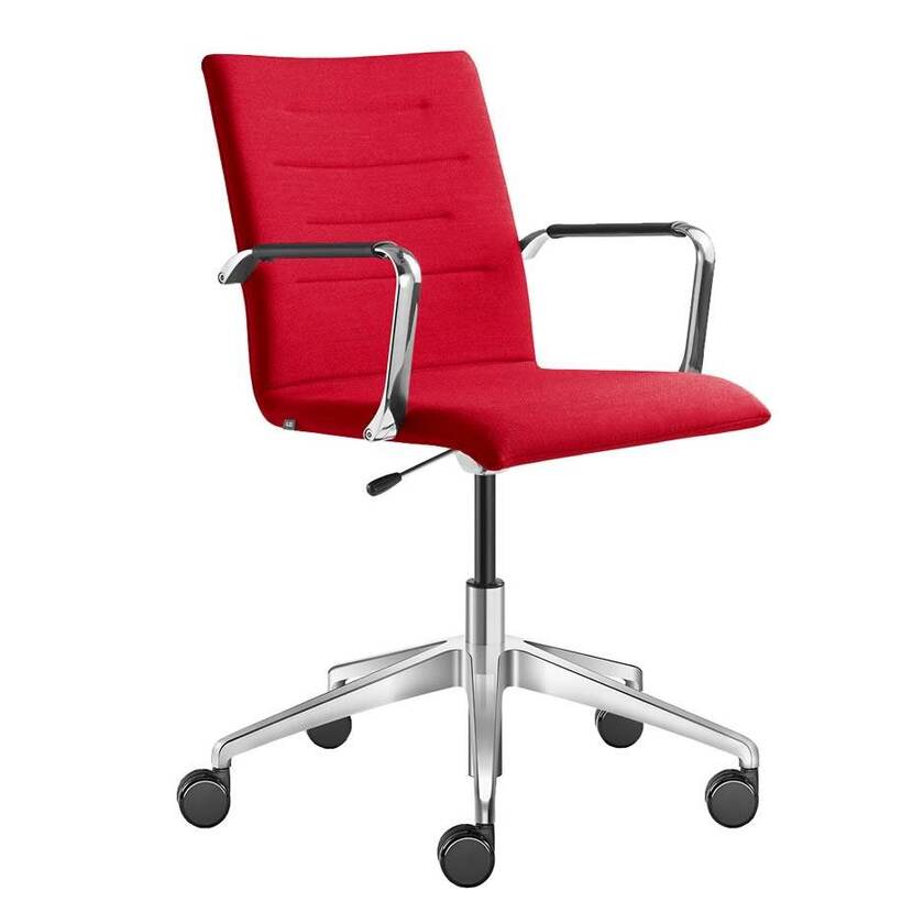Stilren konferensstol på hjul med exklusiv känsla. Valbar i 8 färger Xtreme-tyg. Med underrede och armstöd i borstad aluminium. Som tillval finns skinnklädda armstöd och gungfunktion.