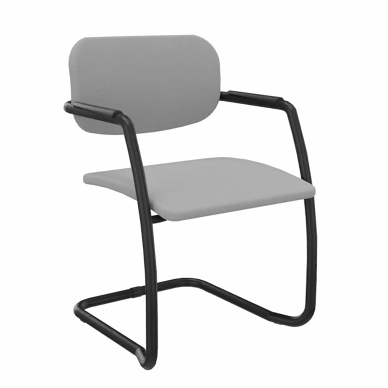 Stol Gama med sviktstativ och armstöd. Staplingsbar. Sits och rygg klädda i tyg Era (100.000 Martindale), valbar i sex kulörer. Stativet av pulverlackerad metall är valbart i metallic grå och svart. Armstödet är försett med plastlist.