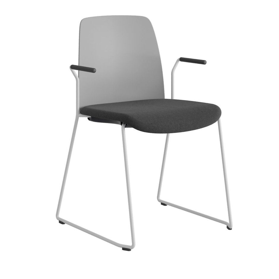 Stol Choice med medar och armstöd, mörkgrå plastrygg, svart tygklädd sits, vitt stativ
