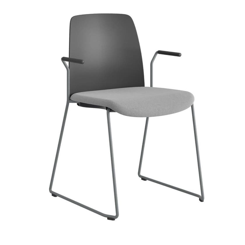 Stol Choice med medar och armstöd, svart plastrygg, ljusgrå tygklädd sits, silvergrått stativ