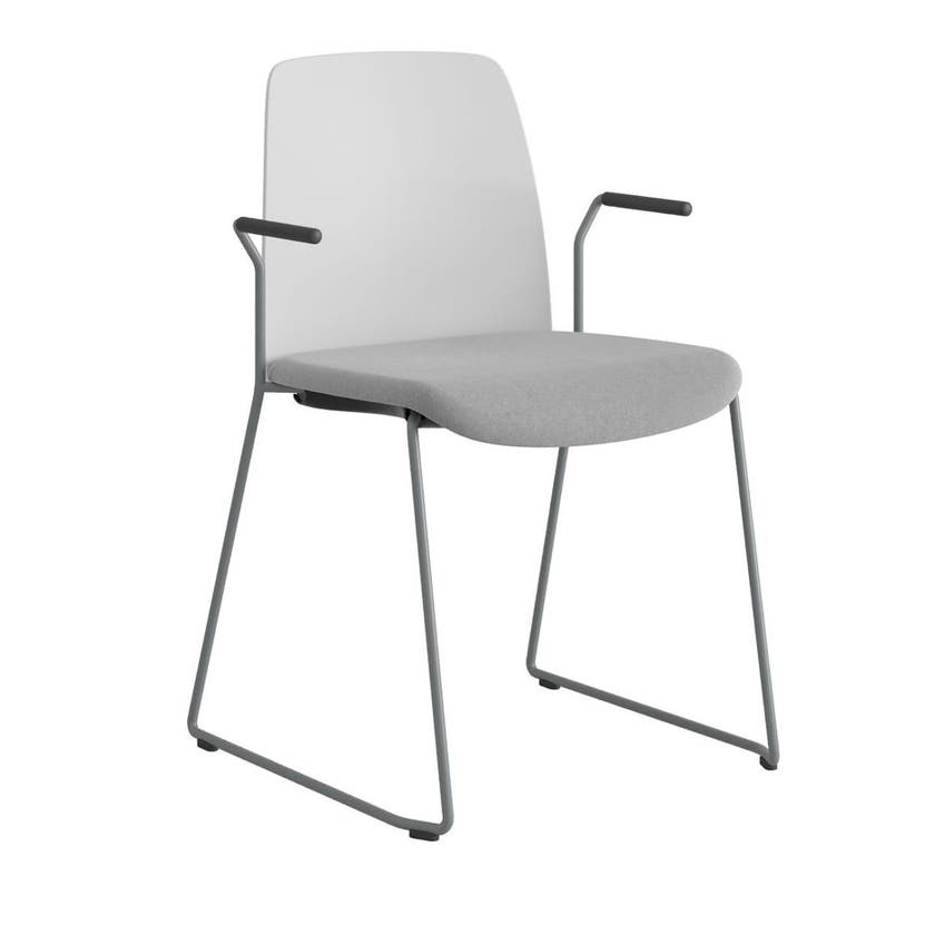 Stol Choice med medar och armstöd, vit plastrygg, ljusgrå tygklädd sits, silvergrått stativ