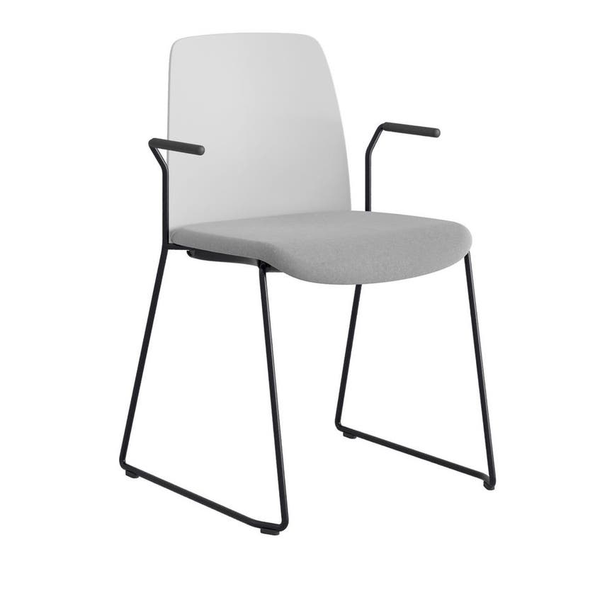 Stol Choice med medar och armstöd, vit plastrygg, ljusgrå tygklädd sits, svart stativ
