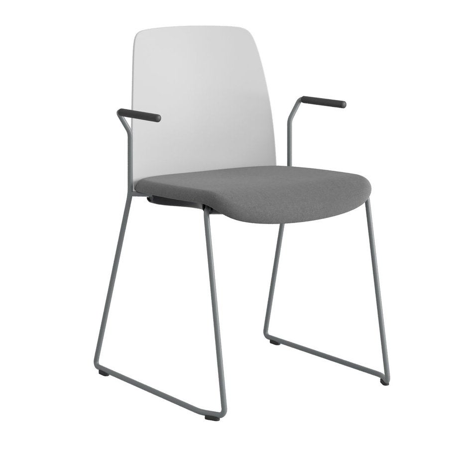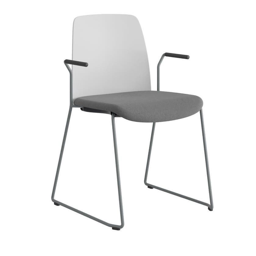 Stol Choice med medar och armstöd, vit plastrygg, mörkgrå tygklädd sits, silvergrått stativ