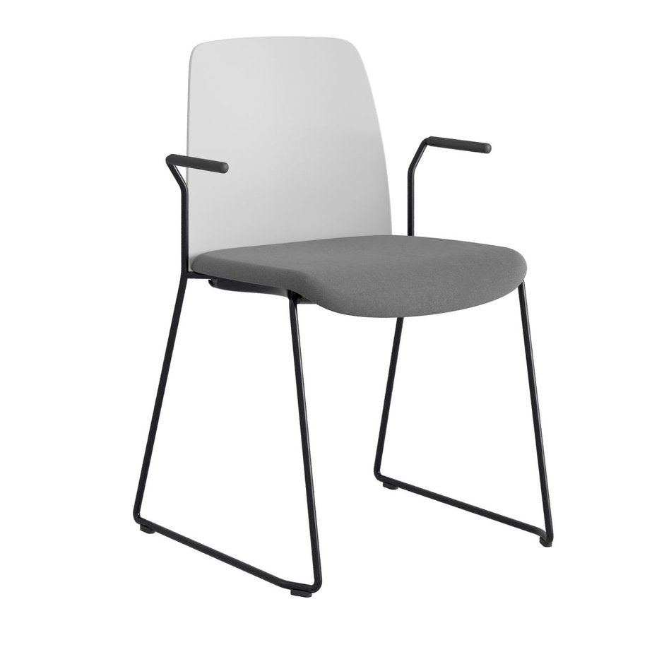 Stol Choice med medar och armstöd, vit plastrygg, mörkgrå tygklädd sits, svart stativ