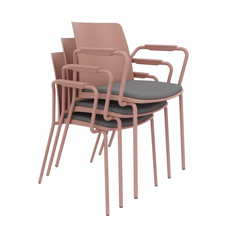 Sitsen har beklädnad i tyg Era (100.000 Martindale) i mörkgrå färg. Gör stolen extra bekväm vid längre sessioner. Det mjukt formade sittskalet är tillverkat av premium-klass polyproylen, skalet är därav extremt tåligt och enkelt att hålla rent. Staplingsbar sex stolar i höjd.