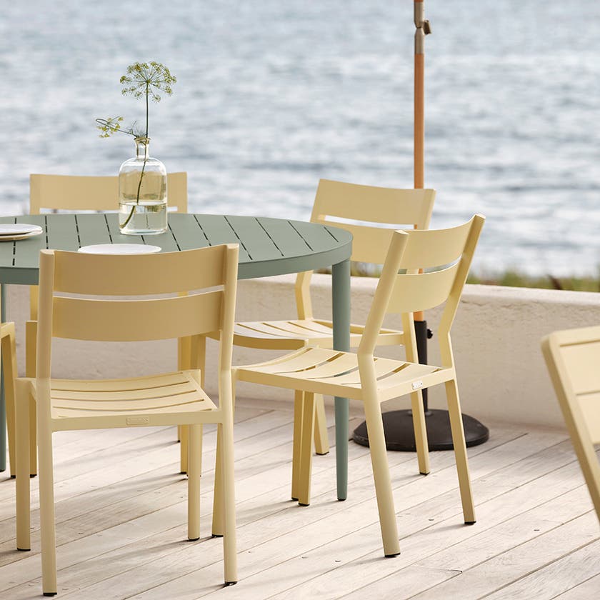 Storstadskänsla och sommar - med eleganta linjer och genomtänkta detaljer kombinerar Bigby det bästa av skandinavisk design. Skapad i tåligt aluminium med läckra detaljer som de avsmalnande benen och den stilrena bordsskivan med ribbor. Somrig färgsättning ger det extra lyftet för känslan.