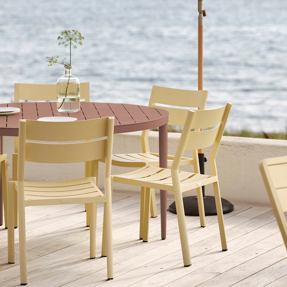 Storstadskänsla och sommar - med eleganta linjer och genomtänkta detaljer kombinerar Bigby det bästa av skandinavisk design. Skapad i tåligt aluminium med läckra detaljer som de avsmalnande benen och den stilrena bordsskivan med ribbor. Somrig färgsättning ger det extra lyftet för känslan.