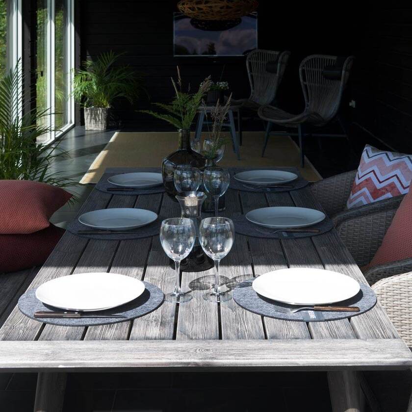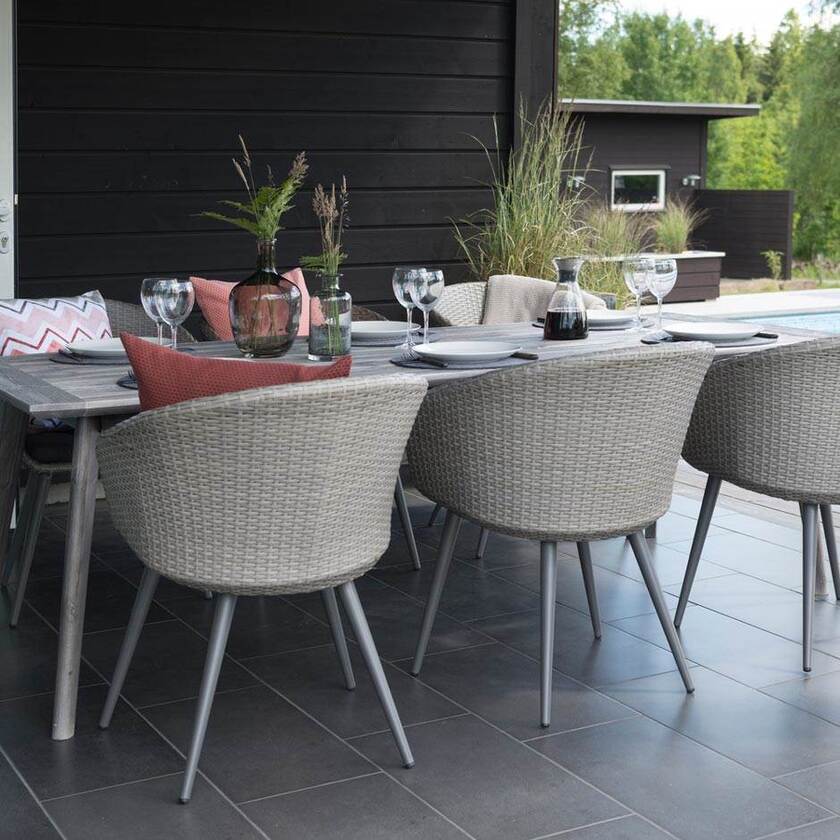 Modern matgrupp där exotisk konstrotting från fjärran östern möter laserad furu från Norrland! 6 fåtöljer i grå aluminium och gråmelerad entrådig konstrotting. Bord i grålaserad FSC®-certifierad kärnfuru med borstad bordsskiva.