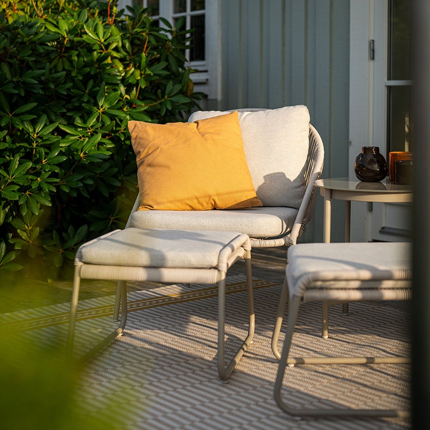 Vårt duo-set innehåller två fåtöljer, två fotpallar och ett bord. Tillverkad i aluminium med rep i olefin och dynor i beige olefin med hög textur. Bordsskiva i glas.