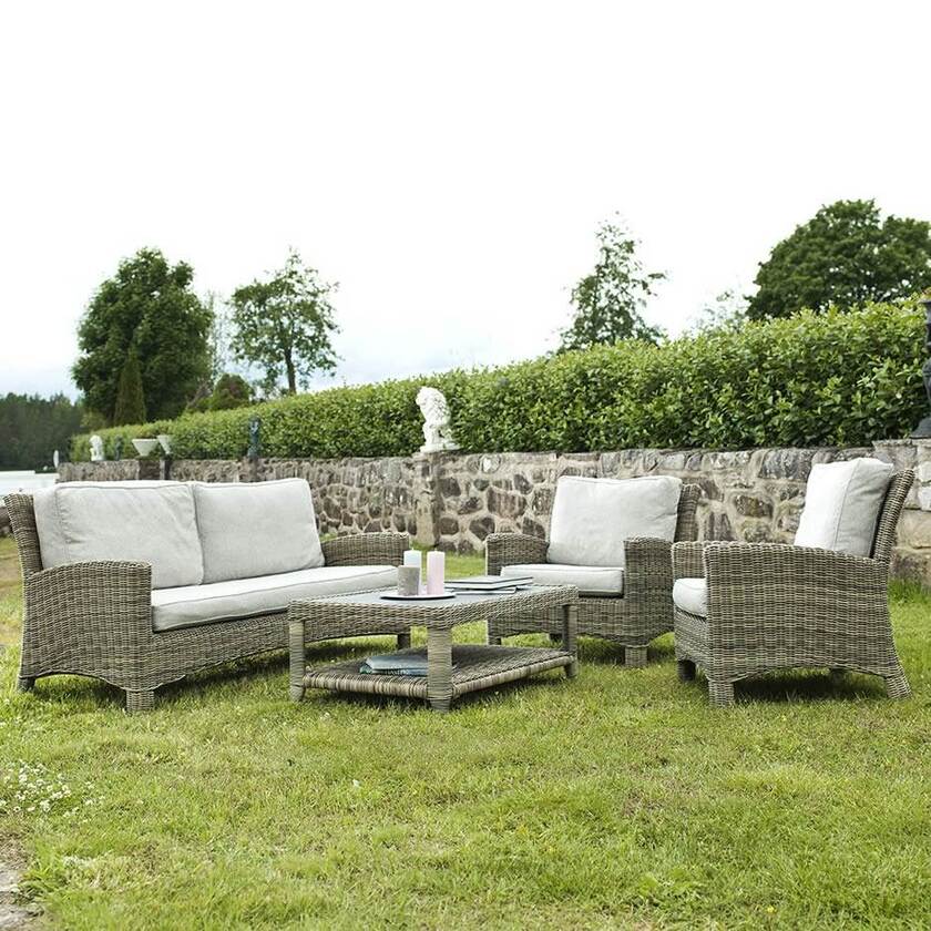 Möbelgrupp Dallas är en maffig loungemöbel med en lite annorlunda mer påkostad konstrottingtråd. Quato-fiber flätat runt en aluminiumstomme. Sköna designdetaljer som ger en go och påkostad känsla. I detta paket har vi valt att inkludera 2 fåtöljer, 1 soffa och 1 st lågt bord med måttet L1100 x B700 x H410 mm.