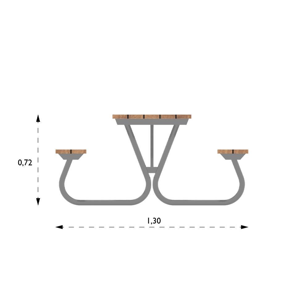 Rymlig picnicgrupp tillverkad i furu med stålkonstruktion som passar in tex i parker och offentliga miljöer. Med en sitthöjd på 45 cm och en totalvikt på 97 kg skapar denna möbel många sittplatser och en bra plats att umgås.