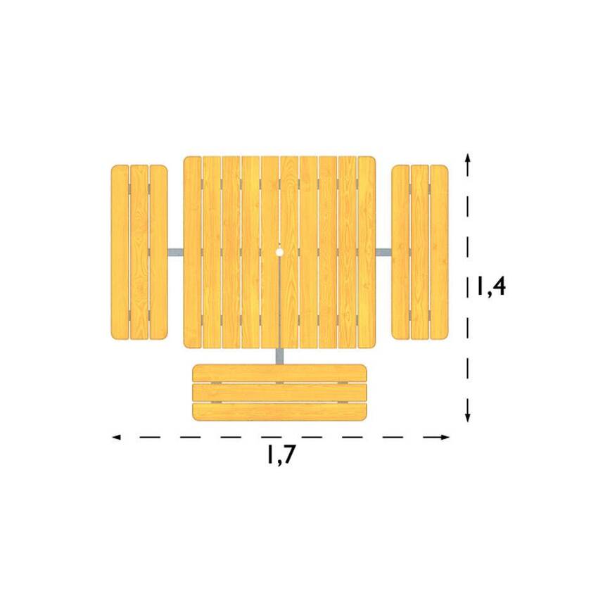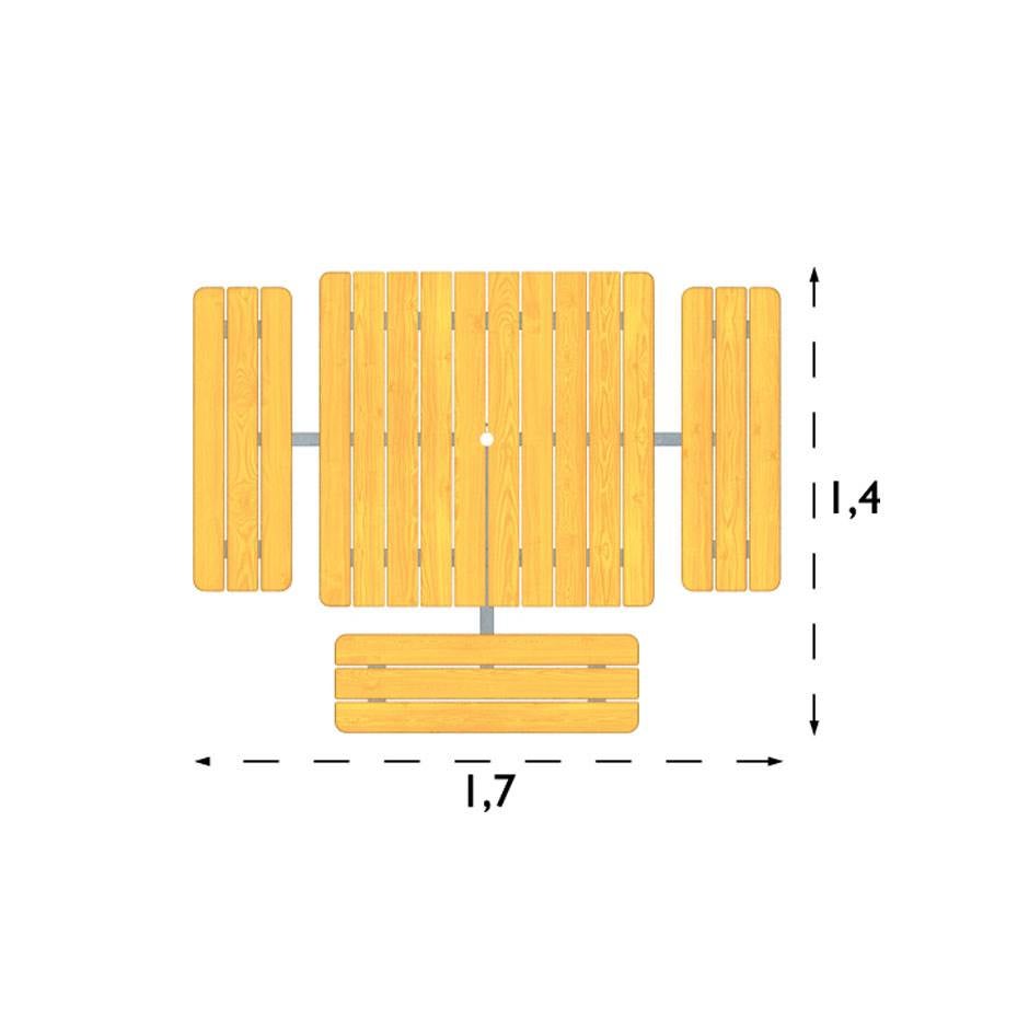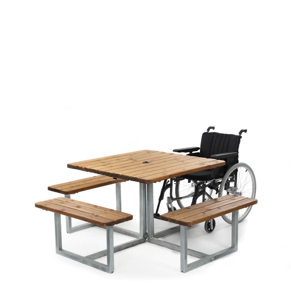 Picknickbord i stilren och snygg design. Bordsskivan och bänkarna är tillverkad i furu och stommen är i stål. En perfekt grupp till parker och stadsmiljöer med robust konstruktion och en totalvikt på 128 kg. Picknickbordet är rullstolsanpassat. Totalt plats för 7 personer.