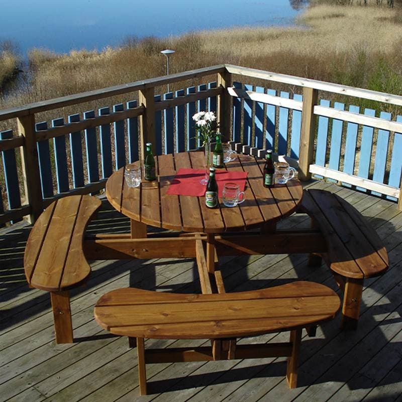 Rondo Picnic ger plats för åtta personer runt ett bord med diameter 1100 mm. Många föredrar denna typen av Picnicgrupp då man inte behöver kliva över sittbrädan för att sätta sig. Sen om det beror på stela ben, att man har kjol eller rent av bara för trånga kläder, det spelar ingen roll. Enklare är det i vart fall! Valbar färg grå bordsskiva och vitlaserade ben eller helbrun.
