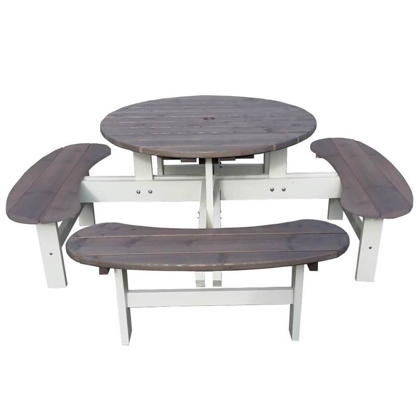 Rondo Picnic ger plats för åtta personer runt ett bord med diameter 1100 mm. Många föredrar denna typen av Picnicgrupp då man inte behöver kliva över sittbrädan för att sätta sig. Sen om det beror på stela ben, att man har kjol eller rent av bara för trånga kläder, det spelar ingen roll. Enklare är det i vart fall! Valbar färg grå bordsskiva och vitlaserade ben eller helbrun.