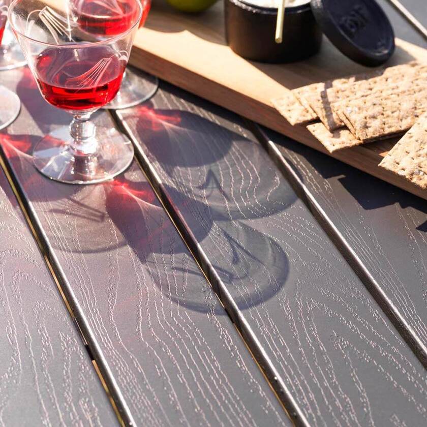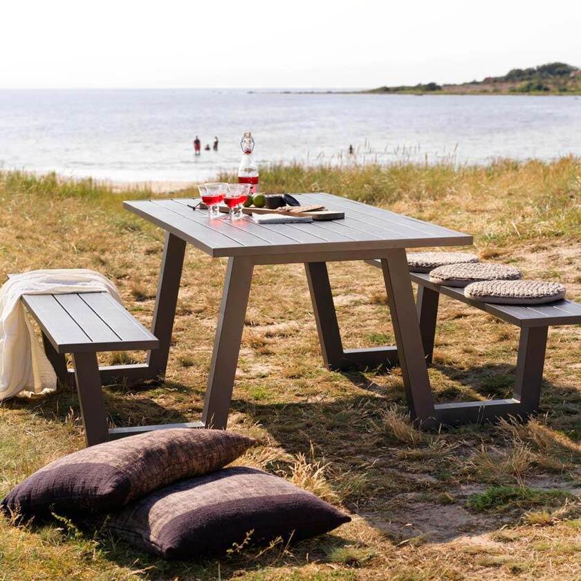 Picnicset i grålackad aluminium. Modern utformning och trästruktur på bordsskiva och sits.