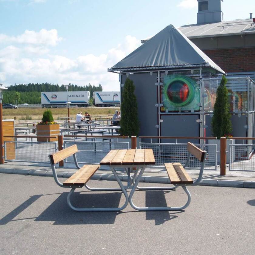 Kraftig sittgrupp med ryggstöd. Tillverkad av Ø45 mm varmgalvaniserade stålrör och 40 mm brunlaserad furu. Bordsmått 1800 x 750 mm, totalmått 1800 x 1800 mm.