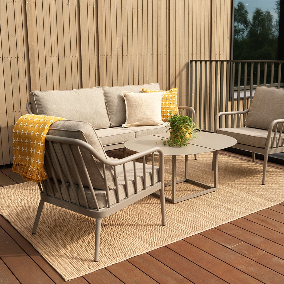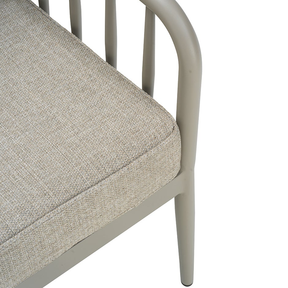 I serien Coleville möter mjuk form rena linjer i en blandning av klassiskt och modernt. Möbeln är tillverkad av rund aluminiumprofil med matt finish, en kombination av tålighet och elegans. Härliga dynor med mjuk sittkomfort där klädseln i olefintyg ger maximal hållbarhet.