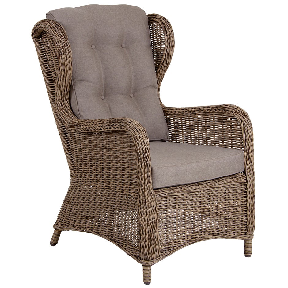 Rymlig fåtölj i härliga utemöbelserien Rosita. Serien Rosita är en komplett samling utemöbler för härliga sommarstunder. Rosita utmärks av sina mjuka former och sin generösa sittkomfort. Välj mellan sköna fåtöljer som du kompletterar med fotpall, bord i olika storlekar och en soffa som det är skönt att krypa upp i. Stativ i konstrotting så naturtrogen att den lätt förväxlas med äkta vara - men det är ju knappast en nackdel.