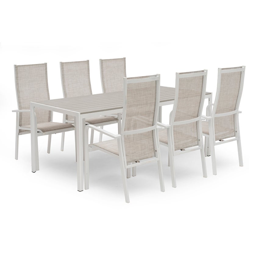 Positionsstol Hånger, Vit aluminium/gråbeige textilene. Stapelbar och ställbar