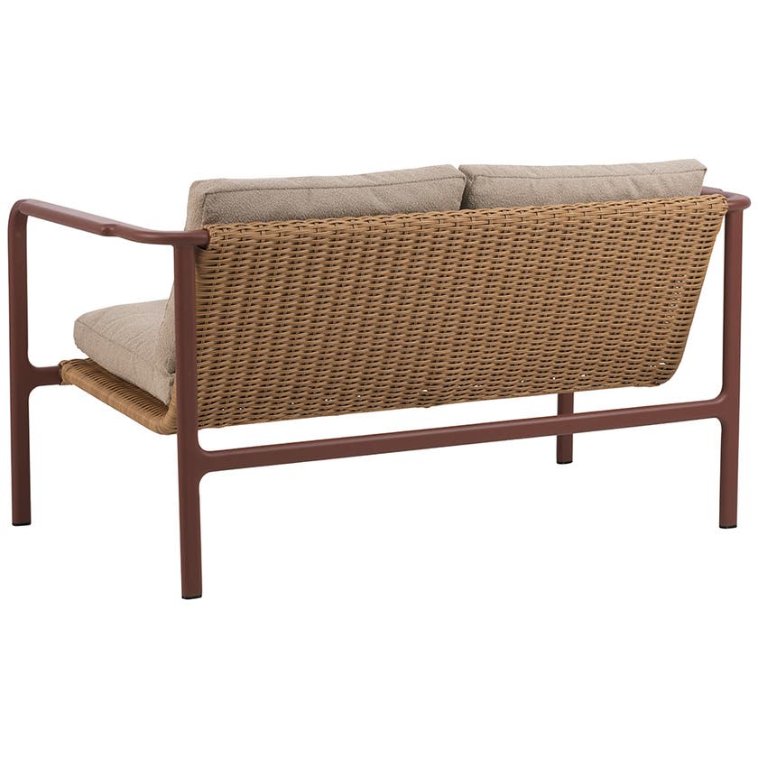 Soffa Motty, 2-sits, totalmått L1400 x D760 x H750 mm, sitthöjd 430 mm, stativ aluminium, färg Zin Red, konstrotting, dyna Teddy Beige