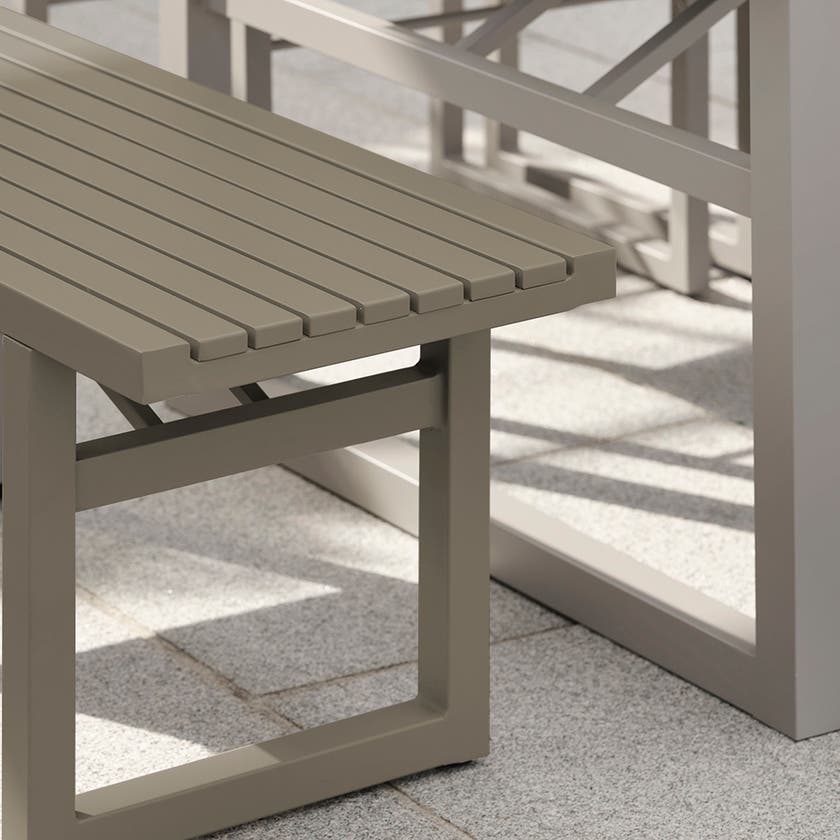 Bänk Vevi kännetecknas av det nordiska formspråket och med sin eleganta, moderna design blir den ett smycke för uteplatsen. Tåligt utförande i aluminium ger en möbel som håller länge.