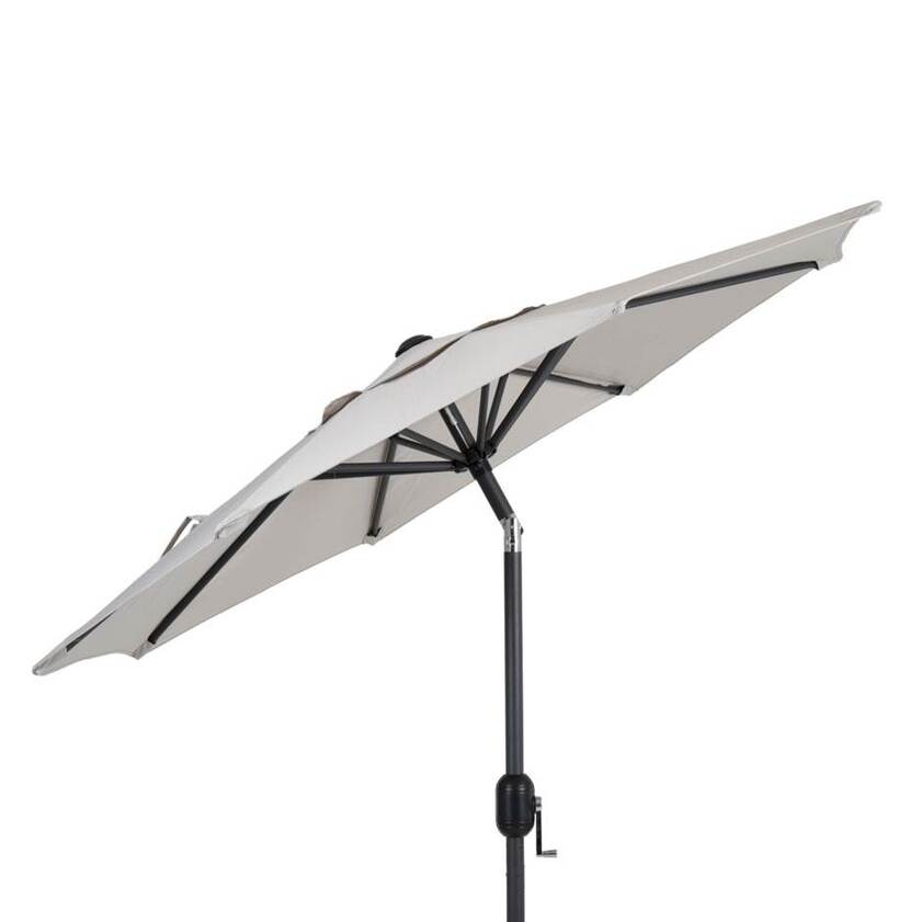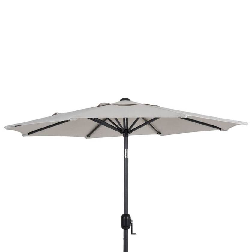 Parasoll Cambre med 2-delad stång i aluminium och 8 stålribbor. 200 gr polyesterväv valbart i grått eller beige. Med ventilationslucka. Vevfunktion. Stomme i antricit.