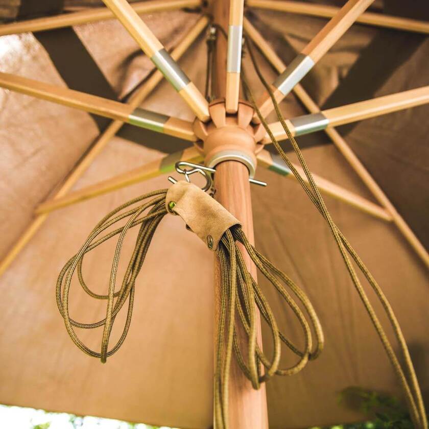 Parasoll Reggio Ø3000 mm av FSC-märkt trä (Sycamore) med mattlackerad yta. 2-delad stång. Vackra läderskoningar och väv av 250 g polyester.