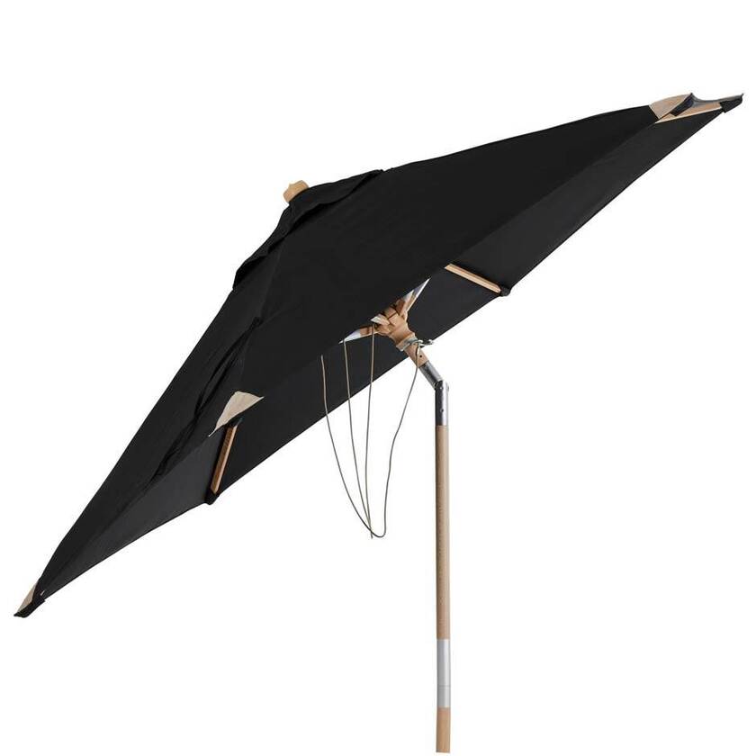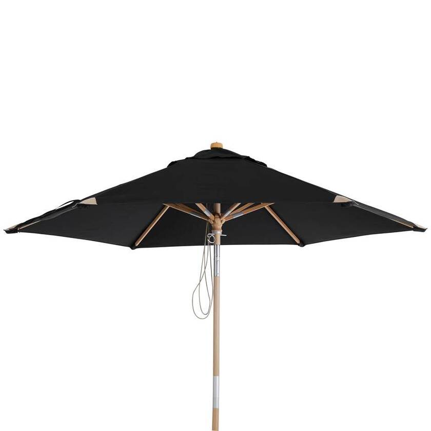 Parasoll Trieste Ø2500 mm av FSC-märkt trä (Sycamore) med mattlackerad yta. 2-delad stång med push-tilt. Vackra läderskoningar och väv av 250 g polyester.