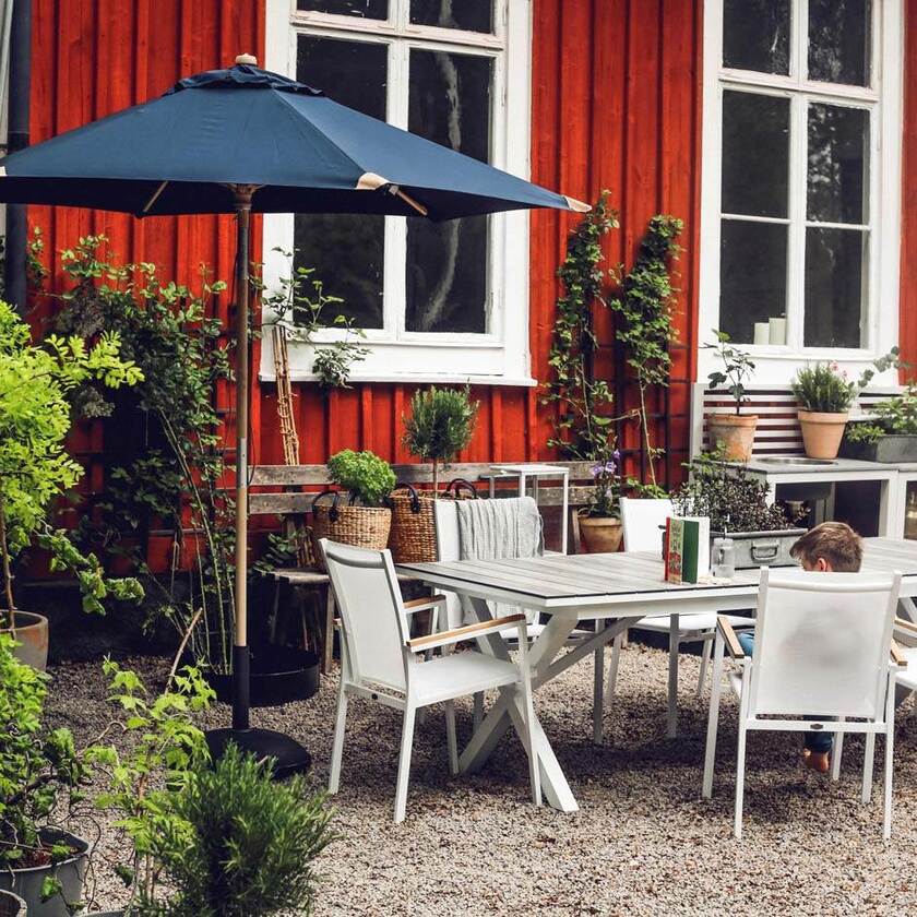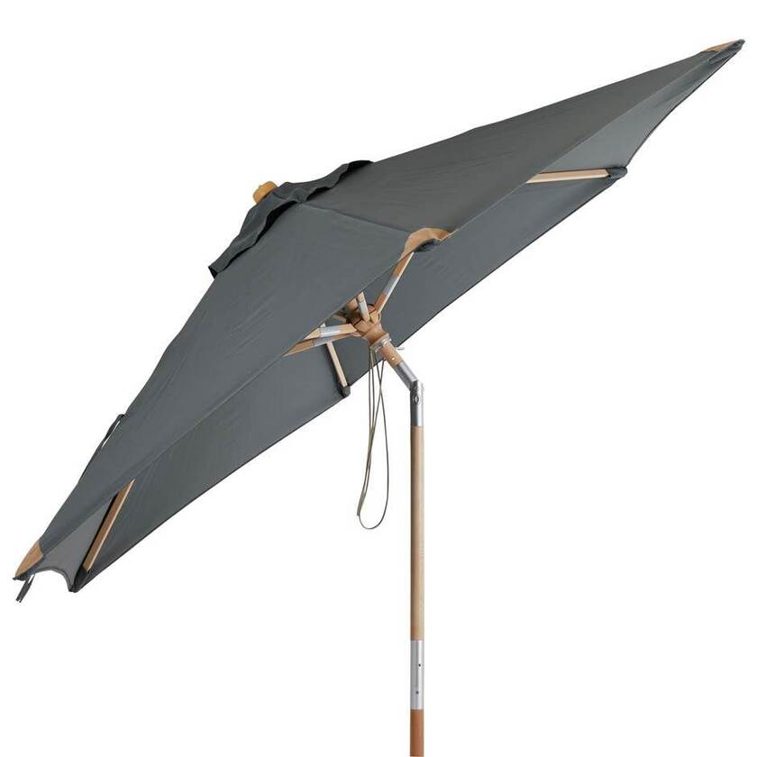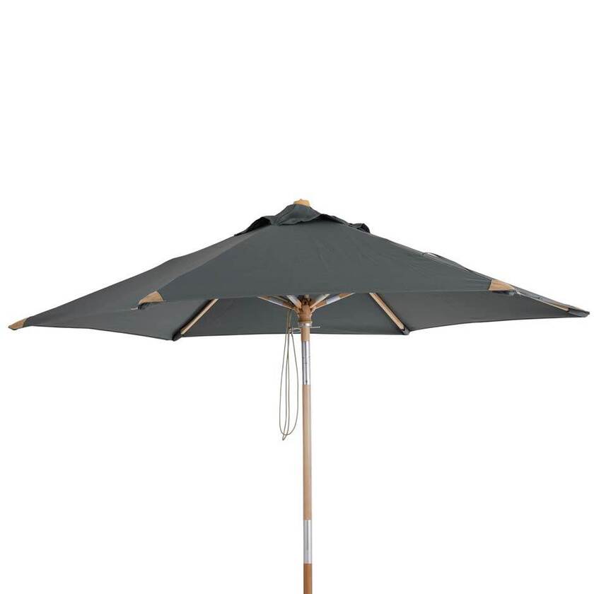 Parasoll Trieste Ø2500 mm av FSC-märkt trä (Sycamore) med mattlackerad yta. 2-delad stång med push-tilt. Vackra läderskoningar och väv av 250 g polyester.