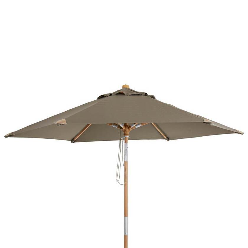 Parasoll Trieste Ø2500 mm av FSC-märkt trä (Sycamore) med mattlackerad yta. 2-delad stång med push-tilt. Vackra läderskoningar och väv av 250 g polyester.