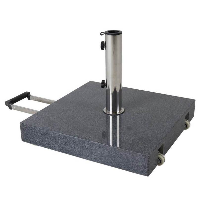Granitfot med två olika färger/ytor att välja på, mörkgrå eller grå. Rör i rostfritt stål. Alla storlekar har handtag och två hjul för enkel förflyttning. För stänger 35-54 mm. Mått 450x450 mm. Välj vikt 30 - 40 eller 50 kg.