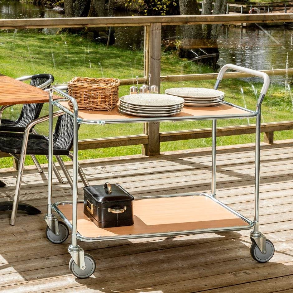 En av våra mest praktiska bordsvagnar med ett mått som även klarar lite större gods. Utrustad med fyra tysta länkhjul Ø125 mm, och klarar 125 kg per hyllplan, totalt 250 kg. Bordsvagnen har tåliga hyllplan av laminat samt greppvänligt och bekvämt plastbeklätt handtag.