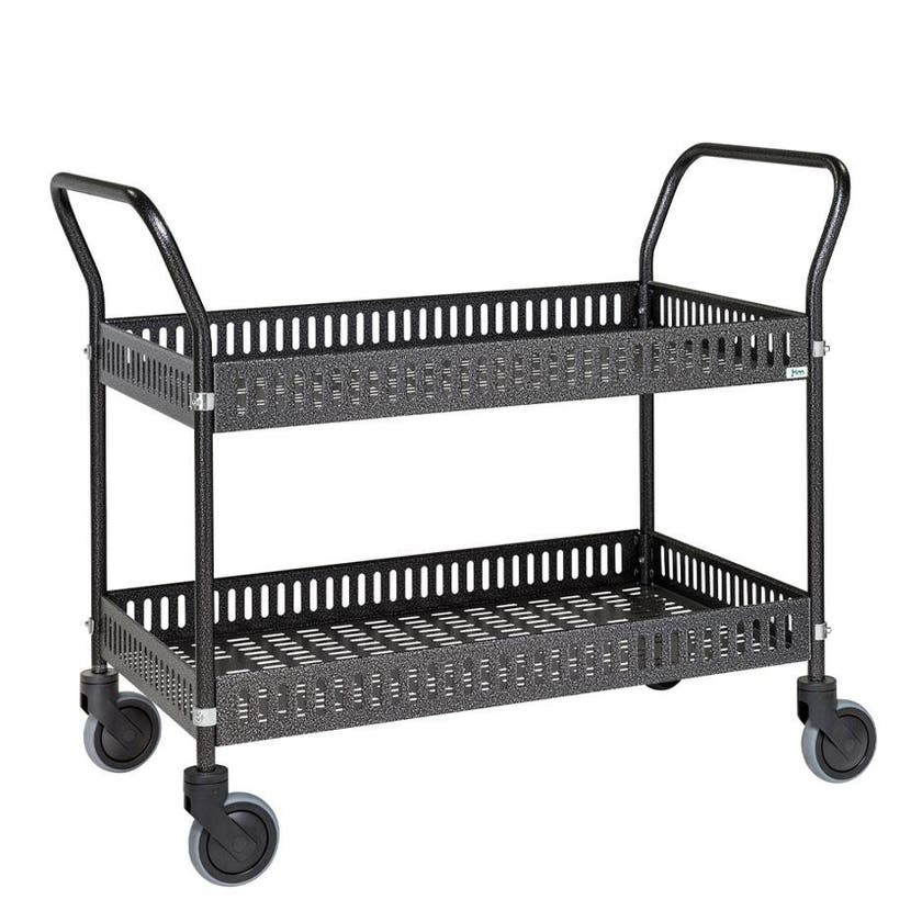 Smidig korgvagn i helsvetsad stålrörskonstruktion. Hyllorna har en rejäl kant (höjd 90 mm), och är perforerade i både botten och kanter. Hyllavstånd 325 mm. Utrustade med 4 st Ø125 mm länkhjul. Vikt 23,5 kg