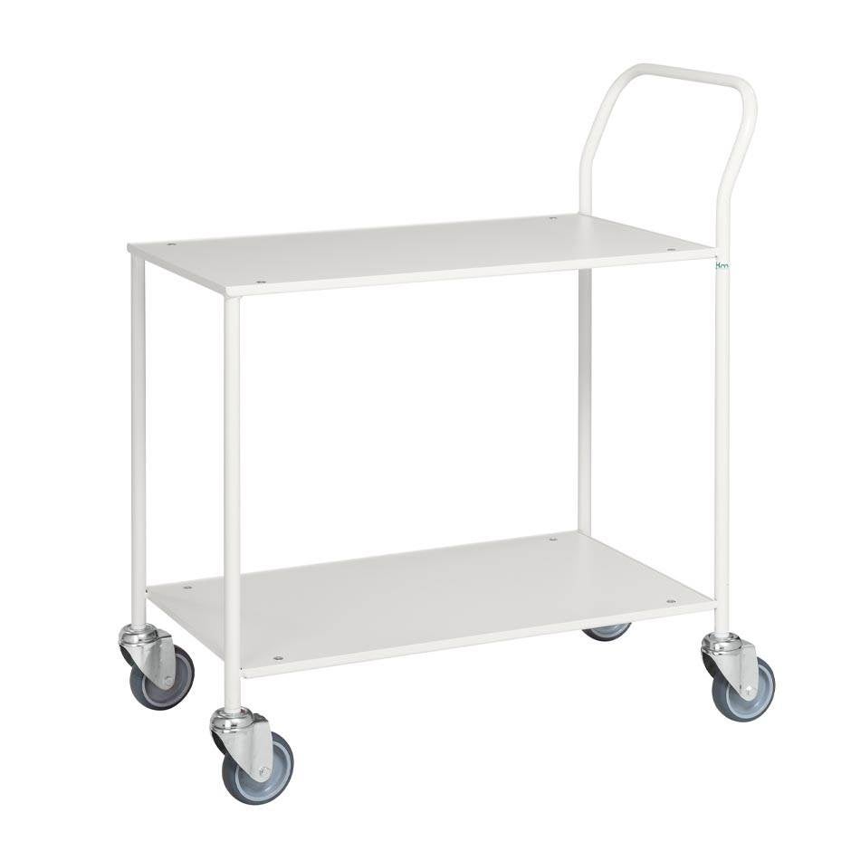 Mindre bordsvagn i 2 plan. Hyllplan av tålig laminat. Bordsvagnen är helsvetsad och har därmed ett robust och tåligt utfarande. Bordsvagnens lastyta mäter 840 x 430 mm, höjd 940 mm. Höjd till översta hyllplan 720 mm, Avstånd mellan hyllplan 515 mm. Maximal belastning 150 kg. 4 st länkhjul Ø 100 mm. Önskar du utrusta din bordsvagn med broms på ett av hjulparen så är det valbart i rullisten nedan.