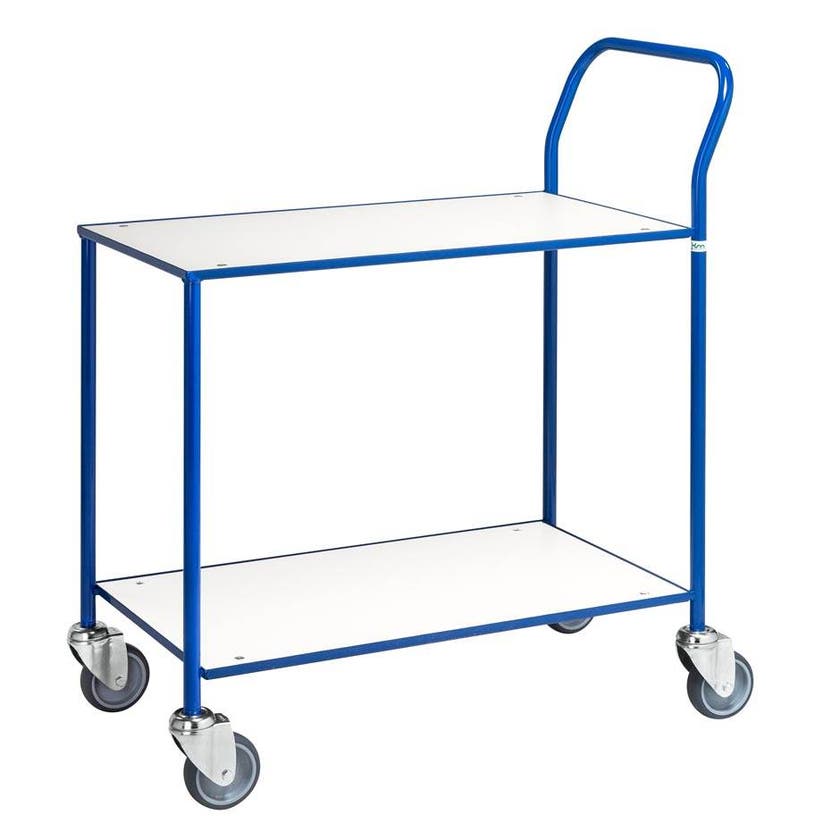 Hyllvagn Oliver med 2 hyllplan. Helsvetsad, pulverlackerad blå stålrörskonstruktion med en lastkapacitet på 150 kg. Svängbara hjul Ø100 mm med grå gummibana. Önskar du förse din bordsvagn med broms på ett av hjulparen är detta valbart i rullisten nedan. Bordsvagnens hyllplan är av tålig, vit laminat.