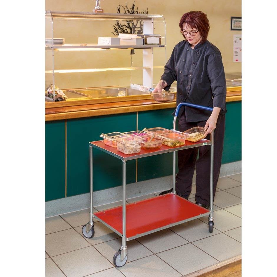 Klassisk bordsvagn. Stativet består av elförzinkat stål. 2 st hyllplan av 10 mm limmad laminat i bok, björk, röd eller vit färg. Plastat blått greppvänligt handtag. Fyra st grå länkhjul, Ø100 mm. Vill du förse din bordsvagn med broms på ett av hjulparen så är detta valbart i rullisten nedan. Belastning: 150 kg. Levereras omonterad.