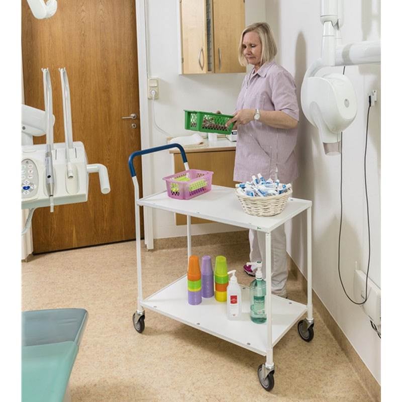 Klassisk bordsvagn. Stativet består av vit eller blå pulverlackerad stål. Bordsvagnens hyllplan består av 10 mm limmad laminat i vit färg. Plastat, blått greppvänligt handtag. Bordsvagnen har 4 st grå länkhjul, Ø100 mm. Önskar du bestycka din bordsvagn med broms på ett av hjulparen är detta valbart via rullisten nedan. Belastning:150 kg. Levereras omonterad.