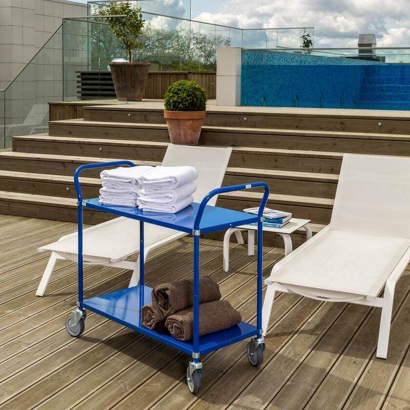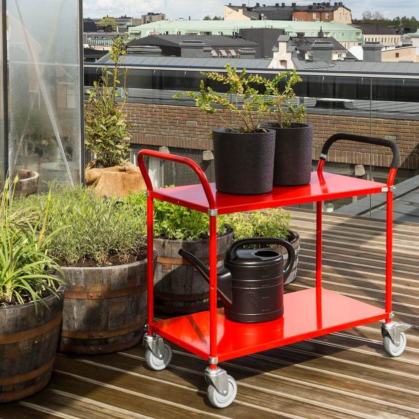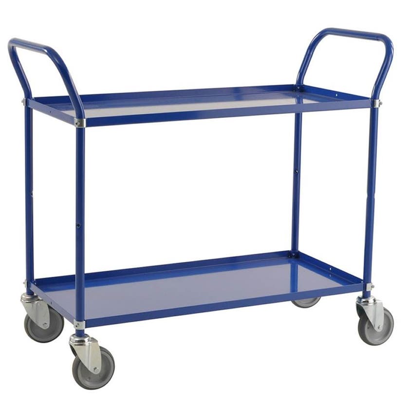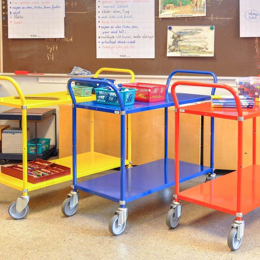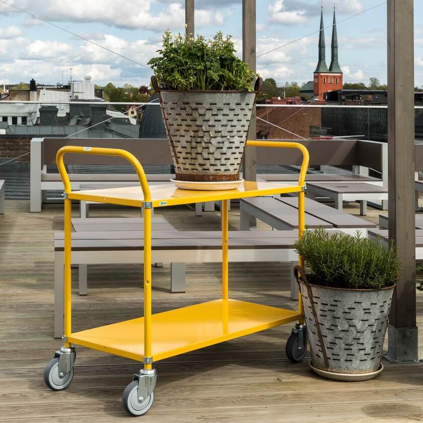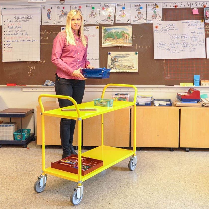 Hyllvagn Color med två hyllor, hyllmått L900 x B440 mm, lackerad. Levereras i monteringsbart utförande och kan monteras med hyllkant upp eller ner. Höjd till övre hyllplan 760 mm. Avstånd mellan hyllplan 530 mm. Utrustad med 4 länkhjul Ø125 mm, med grå gummibana. Är valbar med broms på ena hjulparet. Kapacitet 250 kg. Hyllvagnen är valbar i en rad olika färger. Finns även variant med tre hyllor.