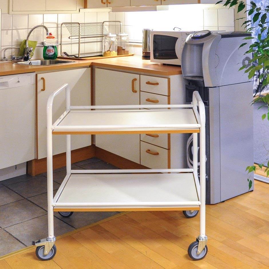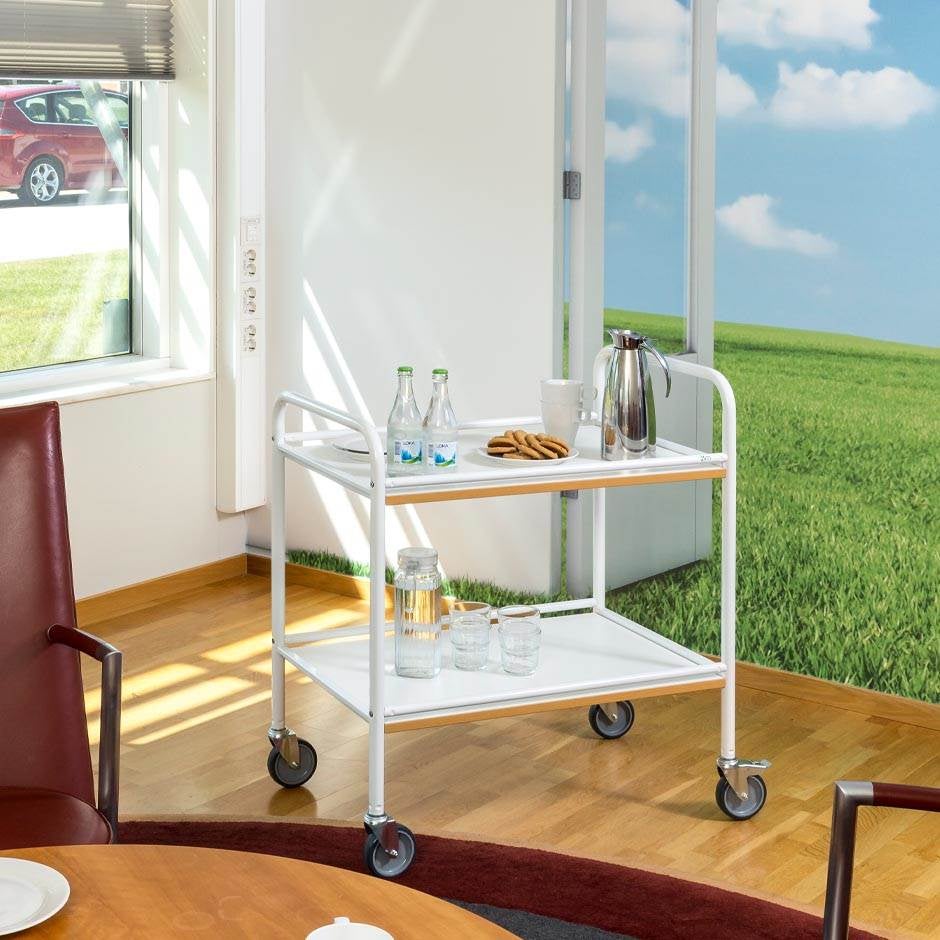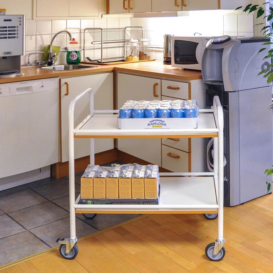 Klassisk och smidig vagn med två hyllplan. Vagnen kan såklart användas inom en rad bruksområden, men passar utmärkt som serveringsvagn. Vagnen har praktiska hyllkanter som förhindrar att saker faller av vid transport. Utrustad med Ø100 mm lämkhjul i gummi, varav två med broms. Vagnen finns med blå- eller vitlackerade metallrör och hyllor med boklist klätt med vit laminat.