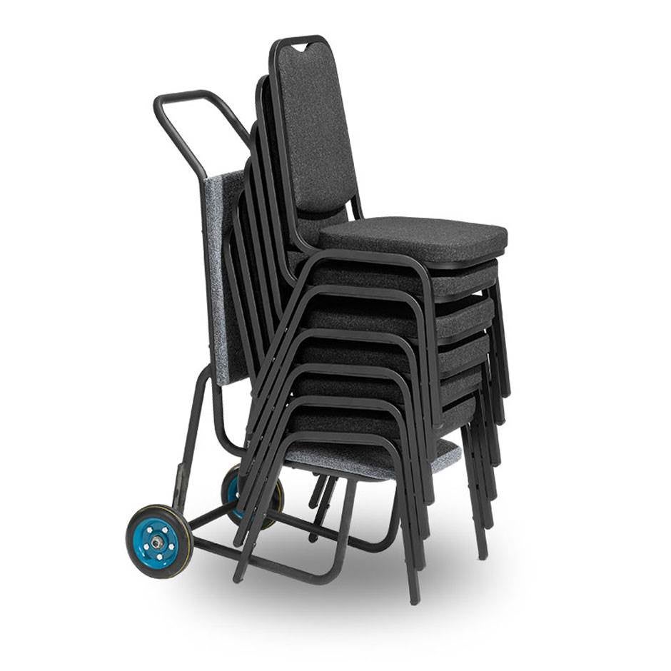 En smidig, stolsformad vagn för förflyttning av stapelbara stolar. Passar i verksamheter som flyttar och förändrar möbleringen ofta så som vid konferenser, utbildningar, föreläsningar eller andra event. Vagnens tygklädda rygg och sits gör att den inte repar lackeringen på stolarna.