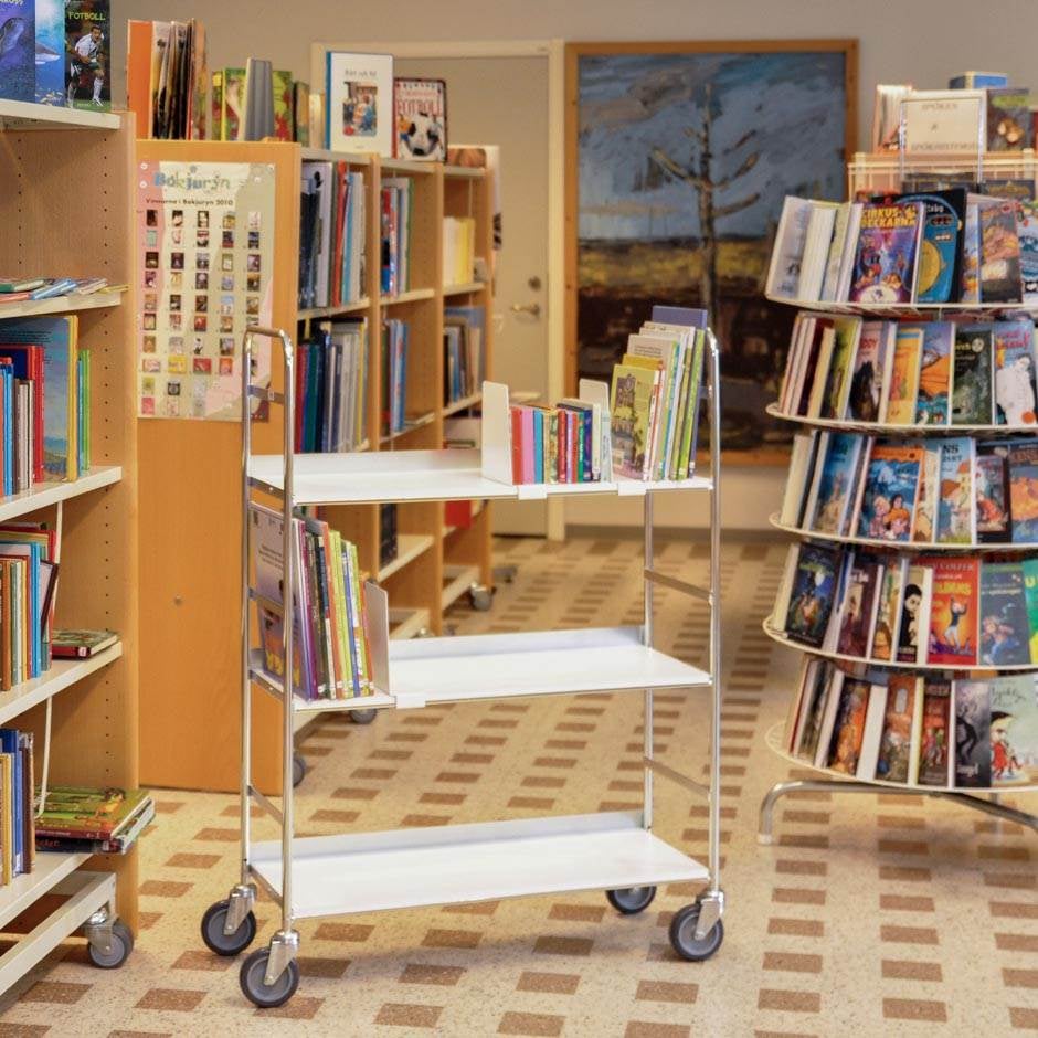 Arkivvagnen har elförzinkat stativ och hyllplan i vit laminat. Höjd till övre hyllplan 890 mm och avståndet mellan hyllplanen är 350 mm. Arkivvagnen är försedd med fyra svängbara hjul som gör den ytterst följsam.