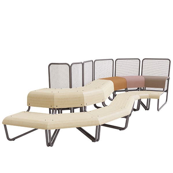 Sara modulsoffa/bänk med formpressad sits och rygg belagd med högtryckslaminat i ek alt klädd. Stålstativ Ø 32 mm. Som tillbehör finns skärm i perforerad plåt som kan användas som avskärmning eller ryggstöd. Bord och golvbeslag finns också som tillbehör.
