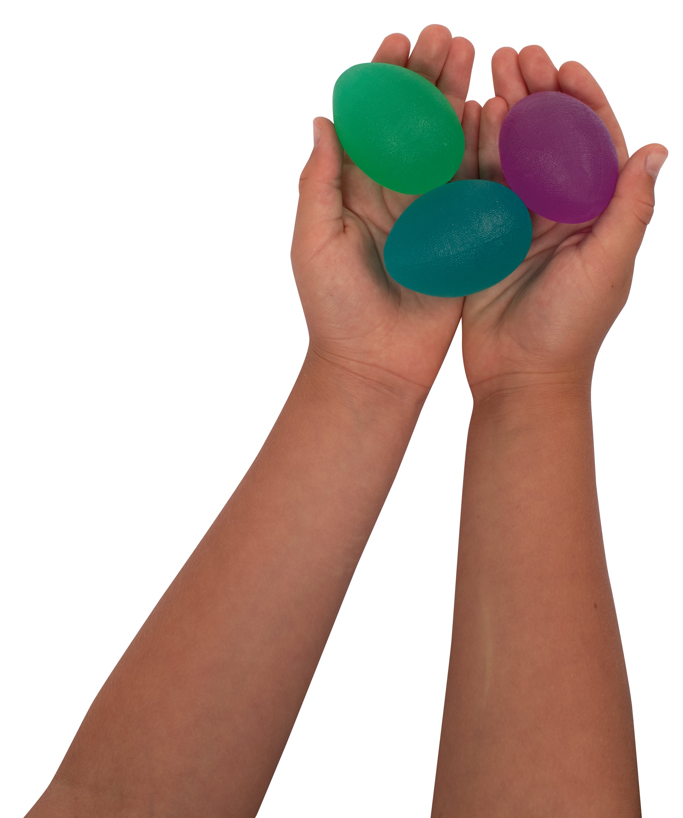 Äggformade stressbollar i tre olika motstånd (fast, medium och mjuk) som förbättrar fingermotoriken. Tränar hand-och fingermuskulaturen. Perfekt att hålla i handen för att underlätta koncentration och inlärning för elever som har svårt att sitta still, är klåfingriga eller bara vill ha något lugnande i handen. Från 5 år.